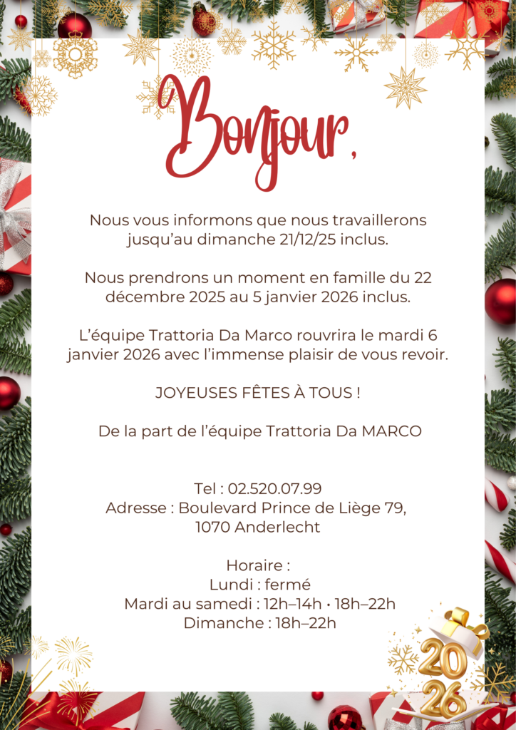 EXCELLENT Basée sur 292 avis Publié sur Jolien De BadtsTrustindex vérifie que la source originale de l'avis est Google. Beautiful food, excellent service … very good Belgian cuisine … staff who were very welcoming and helpful even on a busy Saturday eveningPublié sur Juan Camilo Serna JacomeTrustindex vérifie que la source originale de l'avis est Google. Un service exceptionnel ! Les patrons comme les employés font preuve d’un grand professionnalisme et d’une gentillesse remarquable.Publié sur Filbos GABRAIELTrustindex vérifie que la source originale de l'avis est Google. Super Resto. Très aimable. On mange bien.Publié sur Aziz AKKAYATrustindex vérifie que la source originale de l'avis est Google. The food was absolutely delicious, and Deniz was incredibly attentive.Publié sur David RehouneTrustindex vérifie que la source originale de l'avis est Google. Toujours parfait !Publié sur severine6Trustindex vérifie que la source originale de l'avis est Google. Je recommande vivement ce petit restaurant tant pour la cuisine que pour l'équipe. Les plats de pâtes et les risottos sont délicieux et parfaitement aldente. Le patron et son épouse sont très sympathiques et les autres serveuses sont aux petits soins avec vous. C'est très agréable. Petite carte de qualité, ce qui est appréciable. Il devrait y avoir plus de restaurant qui misent sur la qualité comme chez Marco.Publié sur Laurent Vanden CampTrustindex vérifie que la source originale de l'avis est Google. Première fois après avoir modifié la carte sans les pizzas…et c’est une réussite ! Entrées, plats et desserts maisons sont délicieux et très généreux, à refaire ! Service très convivial et attentionné, soirée anniversaire en famille réussie.Publié sur Julius StonebanksTrustindex vérifie que la source originale de l'avis est Google. Il existe une multitude de restaurants italiens typiques, surtout en Belgique 🇮🇹 Mais parfois, certains sortent du lot — et c’est clairement le cas de celui-ci. Certes, ils ne proposent plus de pizzas 🍕 depuis peu, mais qu’à cela ne tienne : le patron, ancien boucher, sublime ses plats avec des viandes succulentes ☺️ La carte est réduite, et tant mieux : c’est souvent gage de qualité, ce qui se ressent immédiatement dans l’assiette 🍽️ Et pour couronner le tout, le service est aux petits oignons, simple et attentionné — c’est justement ce qui fait tout le charme de l’endroit 😍Publié sur Manuel HANNART S.Trustindex vérifie que la source originale de l'avis est Google. Cette trattoria est excellente ! Que vous veniez en couple, entre amis ou collègues, le nouveau concept est idéal. Le service et la cuisine sont 100 % italiens, respectant parfaitement l'essence et l'héritage familial pour le plus grand plaisir de vos papilles.